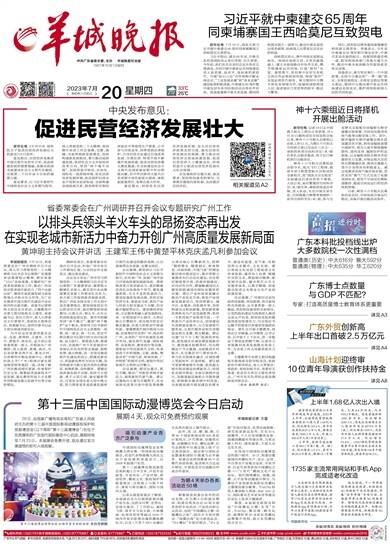 中共广东省委主管、主办 羊城晚报社出版 1957年10月1日创刊 2023年7月20日 癸卯年六月初三 星期四 33℃ 25℃