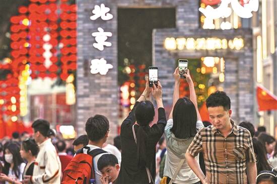游客在北京路步行街内拍照 羊城晚报记者 钟振彬 摄 |