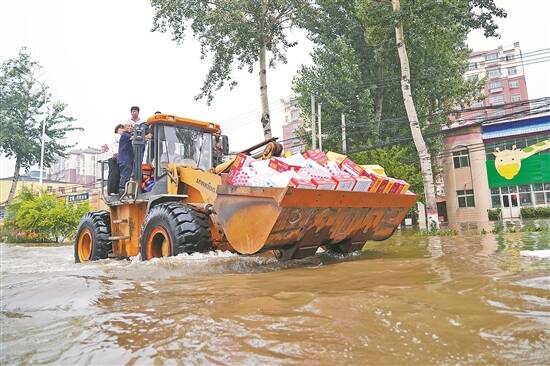 在涿州码头镇,救援队伍通过铲车运送物资 羊城晚报特派河北记者 梁喻 摄 |