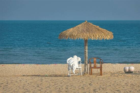 沙扒镇月亮湾的海滨沙滩展出艺术品 羊城晚报记者 邓勃 摄 |