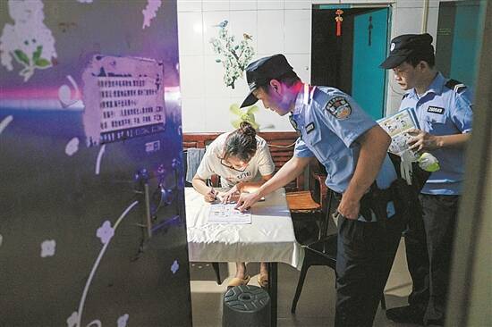 出租屋内,社区民警尹斌和辅警钟胜龙对租户进行防诈教育 |