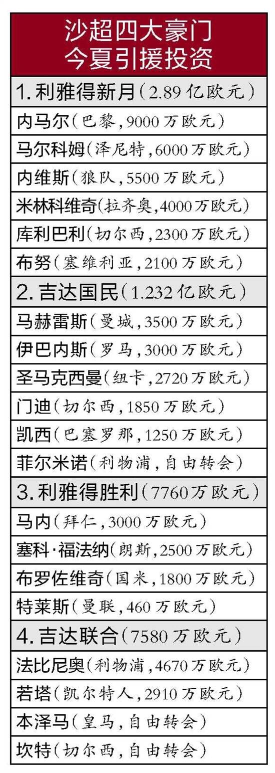 沙特超级联赛不仅是C罗和本泽马等巨星年龄偏大之后发挥余热的乐园,仍处于当打之年的巴西巨星内马尔也来了。这个夏天,沙特“钞”能力在国际足坛引发强震,欧洲五大联赛的球星纷纷加盟,已经引起包括利物浦主帅克洛普在内的欧洲足球名宿的恐慌。 一家基金资助多家强队 如果说C罗今年1月1日加盟沙超,成为领路人,那么内马尔就使沙超今年的引援达到新高度,C罗、本泽马、内马尔等巨星为沙特足球代言。C罗和本泽马的年薪据称达到2亿欧元,内马尔年薪为1.85亿欧元,他们以及其他沙超新援的年薪都数倍于在欧洲俱乐部效力时的年薪。 沙特曾经有意申办2030世界杯,但由于时间上与在海湾地区举办的2022卡塔尔世界杯太接近,沙特已经转而申办2034世界杯。去年在卡塔尔世界杯首轮小组赛,沙特爆冷以2比1逆转最终夺冠的阿根廷,说明这支亚洲传统强队有很好的足球基础。沙特足球还要进一步提高自己的影响力。沙超引进这么多明星球员并不是今年的一锤子买卖,而是在申办世界杯前的长期规划。 由于有沙特公共投资基金(PIF)雄厚财力的支持,沙超今夏引援的预算约为8亿欧元,主要供给利雅得新月、利雅得胜利、吉达联合、吉达国民等强队,目前只用掉了大约5.8亿欧元,还有余量。今后,沙超每年有望继续保持相当可观的引援预算规模。 作为沙特最具盛名的足球俱乐部,利雅得新月今夏引援投资已经高达2.89亿欧元。英超豪门曼城是上赛季“三冠王”得主,引援投资最多的赛季是2017-2018赛季,投入3.18亿欧元。 利雅得新月引进六名强援,分别是内马尔、马尔科姆、内维斯、米林科维奇、库利巴利、布努。内维斯曾以5500万欧元领跑沙超今夏引援的转会费排行榜,马尔科姆后来以6000万欧元成为“新标王”,内马尔近日以9000万欧元升至沙超今夏引援转会费排行榜首位。内马尔和摩洛哥门神布努加盟不一定意味着利雅得新月今夏引援的结束,这支沙超豪门今夏的花费越来越接近曼城最疯狂的2017-2018赛季。 西甲老熟人相聚于此 C罗是五届金球奖得主,本泽马是2022金球奖得主,沙超如果只有这两位巨星,德比战的味道还不够浓烈,因为他们曾是皇家马德里队友。内马尔到来之后,为沙超赛场的豪门德比战加入助燃剂。内马尔虽然成就比不上梅西和C罗,但这位巴西巨星的人气一直居高不下,他的技术水准甚至被认为超过C罗,可以与梅西相媲美。 当年在西班牙国家德比,巴塞罗那“MSN组合”梅西、苏亚雷斯、内马尔与皇马“BBC组合”C罗、本泽马、贝尔的争霸堪称经典。内马尔今夏虽然没有回归老东家巴萨,但他还是巴萨系球星的代表,继续与两位皇马系球星C罗和本泽马分庭抗礼。 在沙超夺冠次数排行榜上,内马尔所在的利雅得新月以18次夺冠独占鳌头,C罗领衔的利雅得胜利和本泽马领衔的吉达联合分别以9次夺冠并列第二。吉达联合是上赛季沙超冠军,利雅得新月与吉达联合的较量有点沙特国家德比的味道,内马尔和本泽马再次争锋。利雅得新月和利雅得胜利是同城德比对手,内马尔和C罗还将狭路相逢,C罗和内马尔都出生于2月5日,38岁的C罗比31岁的内马尔年长7岁。 作为沙特两大城市,利雅得和吉达分别配备两支强队。吉达国民虽然只是沙超“升班马”,但现役球员总身价高达1.5亿欧元,仅次于利雅得新月和利雅得胜利,本泽马的吉达联合以1.19亿欧元降至第四。 上赛季沙超冠军吉达联合与上赛季沙甲冠军吉达国民的同城德比很有看点,本泽马与吉达国民的新援菲尔米诺、马赫雷斯和门迪是欧冠老对手。本泽马当年在欧冠赛场对切尔西门神门迪的“降智”操作,令人记忆犹新。凯西从巴塞罗那加盟吉达国民,他和本泽马曾是西班牙国家德比对手。 沙超打欧冠?不是开玩笑! 以利雅得新月、利雅得胜利、吉达联合等沙超豪门的球员配置参加亚冠,或多或少有点“欺负人”的味道。因为日本、韩国、伊朗等亚洲足球强国的顶级球员大多在欧洲联赛效力,日本俱乐部、韩国俱乐部、伊朗俱乐部的牌面实力很难与沙超豪门抗衡。沙特国脚基本在上述几支沙超豪门效力,再加上这么多球星由欧洲五大联赛投奔而来,沙超豪门在亚冠赛场越来越给人一种鹤立鸡群的感觉。 欧足联主席切费林无力阻止沙超豪门到欧洲顶级联赛“挖墙脚”,但他在设计与沙超和谐共处的办法。欧足联正在考虑把沙超纳入“欧冠体系”,沙超有望从2024-2025赛季开始获得一个欧冠外卡参赛资格。从2024-2025赛季开始,欧冠正赛参赛球队将从32支增加到36支,并把现行的小组赛阶段改为瑞士赛制,每支球队不再像以前那样参加与三个对手的主客场6场小组赛,而是改成在进入淘汰赛阶段之前与10个不同对手进行10场比赛,包括五个主场和五个客场。 为了提高沙超豪门的档次,切费林正在与沙特一起努力。看到亚洲国家以色列和哈萨克斯坦的国家队和俱乐部都参加欧足联比赛,沙特足协也受到启发,准备向欧足联提出申请,希望让沙超俱乐部以外卡球队的身份从2024-2025赛季开始参加欧冠,以提高沙超俱乐部的全球影响力,这与切费林不谋而合。C罗不仅是欧冠历史第一射手,还曾经五次夺得欧冠金靴奖,本泽马和内马尔也都曾经夺得欧冠金靴奖,他们虽然已经加盟沙超俱乐部,但是都还有机会参加欧冠。 羊城晚报记者 刘毅