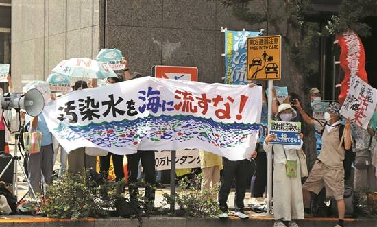24日,日本民众手持“不许将污染水排入大海”等标语在东电公司总部前集会,抗议日本政府和东电公司无视民意启动核污染水排海 新华社发 |