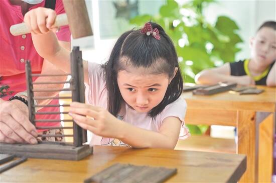孩子们在研学活动中体验制作西关大屋的“趟栊”门 羊城晚报记者 陈秋明 摄 |