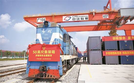 20日,50英尺集装箱多联快车X802次货运列车从广州国际港驶出,一路北上向着长沙而行 新华社发