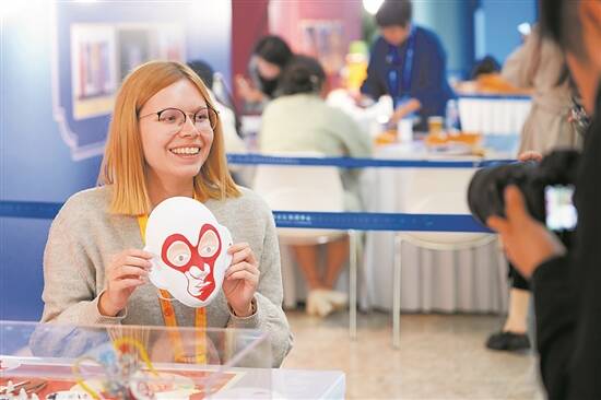 在论坛新闻中心特别设置的非遗传承人现场互动体验区,外媒记者体验京剧脸谱绘制 |