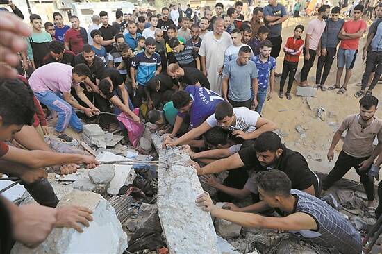 10月16日,在加沙地带南部城市汗尤尼斯,人们在遭以色列袭击后的建筑废墟中救援伤者 新华社发 |