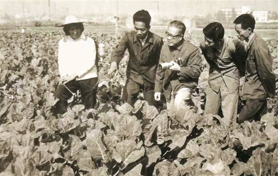 蒲教授在广州新滘公社联星大队菜地检查防治斜纹夜蛾的效果(1978年) |