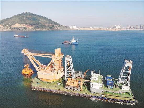 超大型抓斗式挖泥船“金广”在茂名博贺新港区的海面上启动回国建设的首次挖岩试挖作业 通讯员 苏龙庆 摄 |
