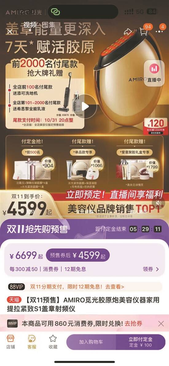 觅光胶原炮美容仪一代线上预售价格为4599元 |
