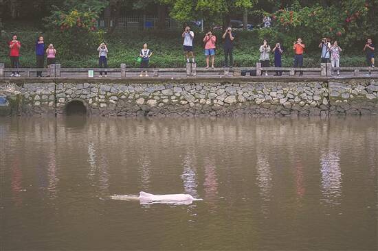 中华白海豚现身广州石井河,引来市民围观 羊城晚报记者 梁喻 摄 |
