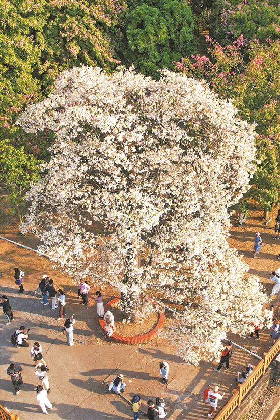 羊城晚报讯 记者陈亮、通讯员王伍报道:近日,华南师范大学广州校区石牌校园内美丽异木棉盛开,给学校增添了一份别样的浪漫。不少校内外师生、市民前来打卡,美丽异木棉在各大社交媒体上一度刷屏。 异木棉,又被称为美人树、美丽异木棉,原产于南美洲,现在在台湾、福建、广东、湖北等地广泛栽培。 据了解,多年前,在东南亚鱼类交流会上,与会的日本专家将美丽异木棉的小树苗送给华师原校长潘炯华作为纪念,回国后潘炯华将树种分别交给当时任园林科主任的陈就和生物系鱼类组老师。据陈就描述,这些漂洋过海的小树苗生长速度非常快,一年可以长高两米。其树形特殊,树干底部膨大如酒瓶,又像人的大肚子,被称为“大腹美丽异木棉”或“酩酊树”。每年9月底10月初开始开花,一直到春节后才凋谢,花期3至4个月。 为方便人们观赏异木棉,华师推出了各个校区的异木棉观赏地图,来迎接前来赏花的人们。