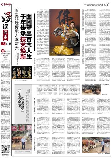 文/羊城晚报记者 谭洁文 实习生 董宣辰 通讯员 杨明伟 图/受访者提供 灵巧的手指在各色面团间翻飞,一把小竹刀随着匠人的手指辗转腾挪,顷刻之间,五颜六色的面团就变成了栩栩如生的艺术形象——这边红脸长须的关羽横刀立马,那边手持净瓶的观世音菩萨衣袂飘飘。这门神奇的手艺叫作“面塑”,也俗称“捏面人”。 “捏面人”民间传统技艺可谓源远流长,汉代就已有文字记载。南宋《东京梦华录》中曾记载:“以油面糖蜜造如笑靥儿。”谓之为“果食”,可见旧时的面塑作品都是能吃的。如今的面塑历经千年的发展,已被列入国家非物质文化遗产名录,踏入了艺术殿堂。而一个个栩栩如生的面塑作品背后,是非遗传承人们持之以恒的努力与热爱,这一点,面塑匠人李宏天深有体会。 手由心发 与面团互相成就 点开李宏天的微信头像,照片里是一个看起来有些老成的男子:在一面写着大大“佛”字的暗红色墙前,李宏天穿着面塑工艺工装,站在一尊半人高的关羽泥塑像后,双手叉在胸前,表情严肃。他的视频号简介里写着“传承非物质文化遗产”。 但让人意想不到的是,这个表情庄重的非物质文化遗产传承人,出生于1999年,今年只有24岁。一个年轻人为何会痴迷于传统面塑工艺?这一切还要从李宏天的成长经历说起。 李宏天出生于广州从化的一个普通家庭里,他从小便有两个爱好:吃,以及听长辈讲历史故事、古典文学故事。“我很喜欢吃。平时待在厨房的时间最多,有时还会帮忙弄一下吃的,那时我就想,当厨师多好,不缺吃的。”与此同时,长辈津津乐道的经典故事也深深地吸引着他,从《西游记》里的孙悟空到《三国演义》里的刘关张,这些故事在他心中播下了传统文化的种子。幼时的李宏天还不知道,这两项看似毫不相关的爱好将在未来产生交集。 15岁时,带着对烹饪的热爱,李宏天踏进了烹饪学校的大门。他以为自己的未来会是在锅碗瓢盆间度过,然而命运却为他准备了一场意外的邂逅:一次偶然的机会,他目睹了一位面塑师傅如何将普通的面团变幻成一个小人儿。那一刻,李宏天被深深触动,一个小小的面人,竟然蕴含了如此深厚的文化和技艺。 从那天起,李宏天的生活轨迹发生了转变。他省下伙食费购买面塑材料,一有空就捏捏自己喜欢的形状。他的双手不再只是为了制作食物,同时也开始捏塑人物和文化。18岁,李宏天跟随中国面塑艺术大师——“面人”箫占行学习,正式接触了面塑这门技艺。经过系统的训练学习,如今一团彩色的面团,在他的十指间几经揉、搓、挤、掀,顷刻之间便可化作一个栩栩如生的神仙或古代故事人物。 经过七年的学习和创作,李宏天的面塑作品开始在各种比赛中获得金奖、银奖。24岁那年,他正式成为面塑和泥彩塑非遗传承人。 “艺术品,不仅讲‘元’更讲‘缘’” 李宏天的面塑作品大多是神仙人物和古代故事人物,创作空间较大。因此在创作前,他会仔细了解即将塑造的人物的故事,想象这个人物穿着什么衣服,面部有什么表情。“做人物面塑最重要的就是神韵,要想做出神韵就离不开对人物性格的揣摩。像捏关公我就会仔细翻阅资料,给人物捏国字脸、丹凤眼,让他天庭饱满,从而捏出不怒自威的神采。” 为了让人物的姿态更逼真传神,李宏天会亲自模拟每一个人物的姿态,因为在他看来,人体比例和肌肉线条都有讲究,“否则作品看起来不协调,不够生动”。他还经常去咖啡店、茶馆里坐一下午,仔细观察往来的行人,在心里镌刻他们的神态和表情。“把每一个人物的形态、气质、神韵等准确、精心地表现出来,才能捏成他们的神韵。最好的方法,就是去观察,创作来源于生活。” 最让李宏天满意的作品,是他在2020年创作的《四大天王》——这是佛教中的四位护法神。由于工艺复杂,《四大天王》的创作周期长达三个月,李宏天甚至在工作室里连续工作了26小时。“当时因为创作比较有激情,自己完全忘记了时间,天黑了又亮,自己始终没感觉到困意,一直处于兴奋的状态。” 谈及作品的售卖,李宏天显得格外慎重。他说不会轻易地将自己作品卖给不懂欣赏的人,“艺术品不仅讲‘元’,更讲‘缘’。‘元’指的是这个艺术品的价格,‘缘’指的是我和顾客之间的缘分”。 在他看来,每一次交易都不仅是金钱的交换,还有作者与收藏者之间的情感联系。“我们传统的面塑艺术品不该像现在一些东西一样,买回家随便看一看就不要了。”他希望他的面塑能找到真正懂得欣赏它们的人,这样他的作品才能真正地被传承下去。 老题材新做法 老手艺新题材 或许囿于材质与上色技法的限制,或许是传统审美所致,传统面塑总是倾向于将颜色做得浅淡。意识到这一点,李宏天便在工作室里开始了一场大胆的创新。“关于颜色搭配,我想要给人家一眼看上去就震撼的感觉,所以我们做的(面塑)在颜色方面比传统的(面塑)更加鲜艳。” 不仅仅是色调的纯度与亮度,李宏天革新的是一整套色彩搭配体系,一种带有鲜明创作者烙印的审美取向。每一种颜色都经过李宏天的反复调配和试验,以确保面塑作品整体色调协调统一且充满视觉冲击力。 如果将李宏天的传承与创新之路总结成一句话,那就是“老题材新做法,老手艺新题材”。他将传统技艺与时代元素相结合,创作出诸多别具一格的面塑作品。今年10月16日,是中国第一颗原子弹成功爆炸的59周年
