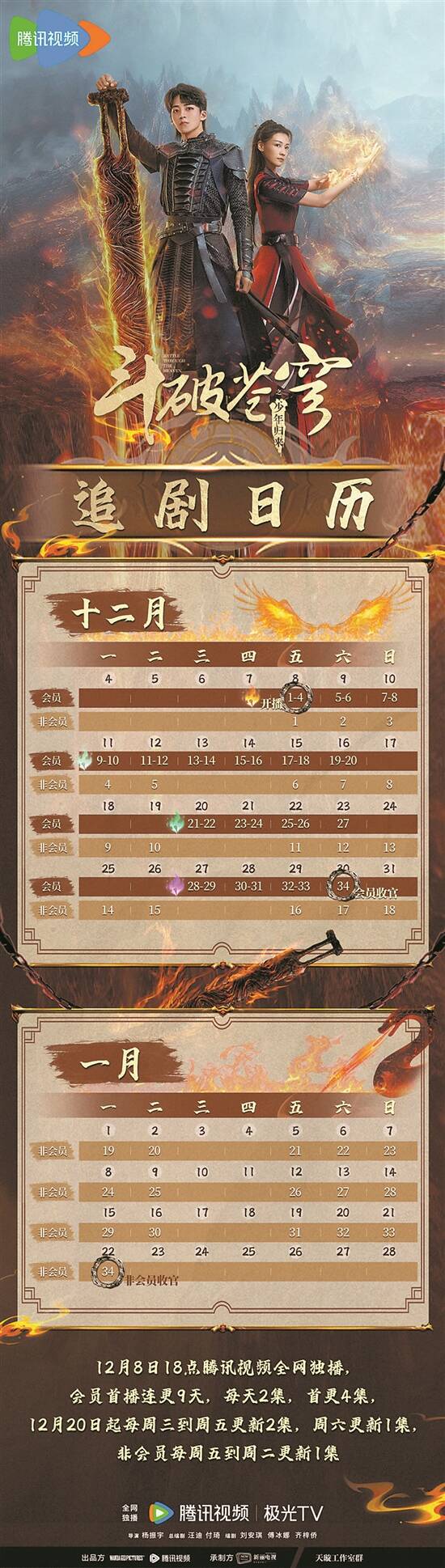 《恋恋红尘》:古力娜扎、徐开骋“并肩同行” 播出平台:腾讯视频 古力娜扎、徐开骋主演的电视剧《恋恋红尘》12月7日在腾讯视频全网独播。 《恋恋红尘》根据北倾的小说《红尘滚滚滚》改编,讲述了30岁之际进入迟来叛逆期的宋星辰(古力娜扎饰)与极夜救援队队长苏清澈(徐开骋饰)因相亲偶然结识,在温暖相伴中共赴一场“并肩同行”的爱情。 《斗破苍穹之少年归来》:网文经典搬上荧屏 播出平台:腾讯视频 何洛洛、丁笑滢领衔主演的网剧《斗破苍穹之少年归来》发布追剧日历。该剧共34集,于12月8日在腾讯视频开播。 该剧改编自作家天蚕土豆的经典作品《斗破苍穹》,主要展现了热血少年萧炎(何洛洛饰)的成长史。少年萧炎不惧世俗的偏见和白眼,在经历了一系列艰苦的试炼后,最终获得了无上的力量,联手自己的师父和伙伴,打败了为祸天下的邪恶势力,拯救了苍生,也坚守了自己“莫欺少年穷”的修炼初心。 《鸣龙少年》:张若昀、丁黑再合作 播出平台:CCTV-8、优酷 张若昀、黄尧领衔主演的电视剧《鸣龙少年》发布定档预告,宣布将于12月10日起在CCTV-8和优酷同步播出。官方微博配文称:“直面不公与挫折,你走的每一步都算数。看潜力考生搬运工雷鸣如何力挽狂澜,指引11班同学们在迷途中重燃斗志,峰回路转!”这也是导演丁黑和张若昀继《警察荣誉》之后的再次合作。该剧主要讲述了优秀教师雷鸣(张若昀饰)和心理老师桑夏(黄尧饰)共同成立了鸣龙十一班的故事。为了让学生们重拾梦想,雷鸣和桑夏因材施教,引导学生养成良好的学习习惯,帮助每个学生直面困境,改善家庭关系,建立乐观的心态,从而赢得了学生们的信任与爱戴。最终,这批学生通过努力考入心仪的大学,开始新的人生旅程。 (丁克)
