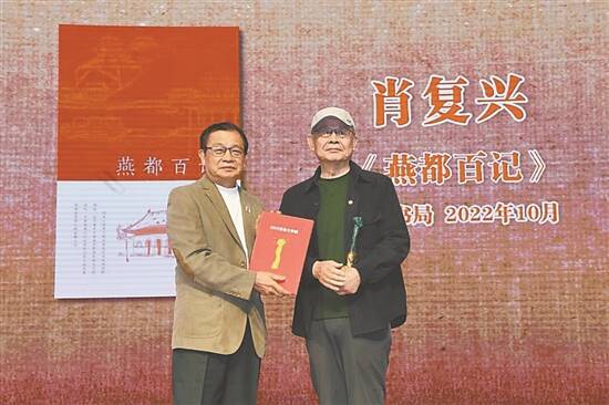 香港作家联会会长、香港文学馆馆长潘耀明为肖复兴(右)颁奖 |