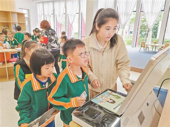 同学们在校园分馆里借书 广州少年儿童图书馆供图 |