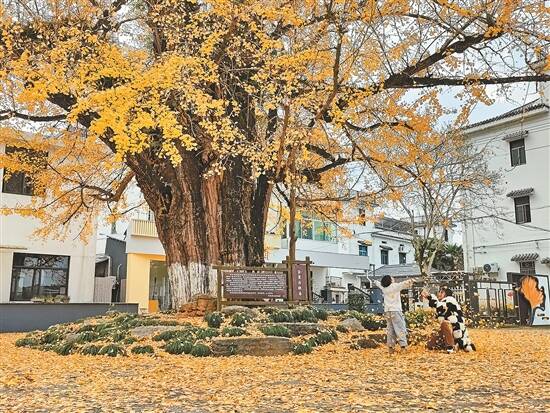 □图\文 徐曙光 12月上旬,浙江开化县华埠镇金星村的一棵银杏树,高37米,树围6.98米,只见金黄色的叶子随风飘舞,满地金黄,吸引了不少游客前来游玩和拍照。 随手拍专用邮箱: ycwbwyb@163.com