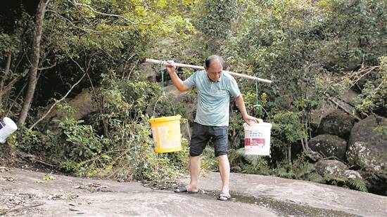 台风过后供水中断,刘清伟去山上的水源处挑水 |