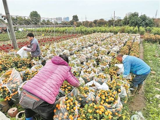 文/羊城晚报记者 梁善茵 图/羊城晚报记者 梁善茵 实习生 何文涛 货车鸣笛声响起,一排排年桔随风摇曳,挂满枝桠的金黄果实相互“簇拥”。1月26日,在气温不到十摄氏度的佛山市顺德区陈村镇仙涌村,桔农们正为节前的最后一批出货做准备。 享有“千年桔乡”美誉的仙涌村聚集近2000个年桔种植场,年桔的年销售量高达180万盆,年销售额超亿元。桔田各处遍布忙碌的身影,几位工人骑三轮车把年桔载到路边,等待装货;不少桔农正修剪杂枝、为年桔围上保护网;桔场负责人在路边指挥装货,吆喝声不绝于耳。 在粤语中,“桔”与“吉”同音,带有吉祥如意、大吉大利的寓意。新春期间,家家户户都喜欢在家中摆上一盆年桔,农历新年也成为了年桔的旺销期。不久后,停满乡间小道的货车即将奔向各地,为全国人民送上一抹“广东年味”。 年桔喜丰收 技艺代代传 看到记者走近,一位桔农在远处摆摆手:“卖完啦,拉完这车就收工。”他表示,由于去年冬季气温普遍较低,北上的货车大多提早运货,去年国庆假期前后就有熟客陆续订货。据他介绍,高峰时段每天有五六辆货车抵达,以12寸年桔为例,每车可运载50盆至60盆。 “去年的收成比前年好,销量也更好,12寸、16寸的年桔最受欢迎。”种植户李志成到现在为止卖出了近千盆年桔,预计在近两日全部卖出。身处全国最大的年桔产地,他和附近种植户生产的年桔销往全国各地,省内主要以潮州、汕头、东莞、韶关为主,省外则运往湖南、湖北、广西等地。 “去年种了三四百盆,已经全部预定出去了。”种植户梁广干的身后有一片倒扣着的花盆,那是大批年桔被运走后留下的印记。而在隔壁桔田里,开春后移栽的年桔幼苗已经长出一寸高。梁广干表示,幼苗借助柠檬枝自身系统输送水分、无机盐和有机物,辅以当地适宜的水热条件,春节过后便可移植到更大的花盆里。 三、四月移栽,六、七月转盆,八月制水催花,十月精剪吊桔,一盆桔树需要生长两到三年才能挂果,一年开几次花。年桔种植技艺的代代相传,离不开当地农户的匠心守望。李志成种年桔已有十余载,他的父辈同样以种桔为生,几亩地的蒂落果熟养活了三代人。 随着种植产业的科技化、规范化,陈村年桔在2018年10月获国家农产品地理标志登记保护,除了销往粤港澳地区,还远销新加坡、马来西亚等东南亚国家。同时配合岭南理学院、陈村镇年桔文化馆、朱子学堂、“桔场时光”年桔文化传承基地等展示场馆,打造出“百千万工程”农文旅融合发展的陈村样板。 农文旅融合 桔乡新气象 “陈村仙涌种植年桔的历史已有上千年。”据仙涌村委会办事员卢梓濠介绍,明代屈大均的《广东新语》提及了明末陈村广植柑橙,清朝咸丰年间编撰的《顺德县志》则有“陈村岁载花果出售诸郡”的说法。改革开放后,经过产业结构的优化,年桔和花卉逐渐成为仙涌村的支柱产业。 为了更好地传承年桔文化,2020年1月3日,年桔文化展示馆正式开门迎客。馆内介绍了陈村年桔的种植历史、品类及种植方法,文化体验区设有“年桔大富翁”、知识抢答等游戏,鼓励前来研学的学子了解年桔文化。 近年来,依托一年一度的“年桔文化活动周”,仙涌镇举办了桨板游桔海、年桔创作大赛等活动,打造创意文旅新体验,用实践不断深化“中国人自己的节日树”的文化内涵,助力陈村的年桔文化热从地里“燃”至云端。 在距离年桔文化馆几百米的“桔场时光”年桔文化传承基地,一个团队正在用“更潮更好玩”的方式推广年桔——直播带货。“买过陈村年桔,万事大吉一定得”“陈村年桔Very good”,陈村年桔登陆各大电商平台,为农户带来经济收益的同时打响本土品牌。 “我们希望教会桔农接触互联网平台,免费提供‘桔场时光’作为直播基地,帮助他们尝试直播、团购带货。”陈村镇年桔协会副会长梁钜东及其团队与线上平台、物流公司和桔农三方对接,畅通销售渠道,为年桔“上云端”保驾护航。 这几天,梁钜东所在的团队正为即将开幕的陈村花市“备货选品”,除了龙形年桔盆栽,还有年桔香薰、年桔果干、年桔洗手液等文创产品。“变的是年桔走进千家万户的形式,不变的是背后的历史文化,以及人们对新一年的美好期盼。”梁钜东说。