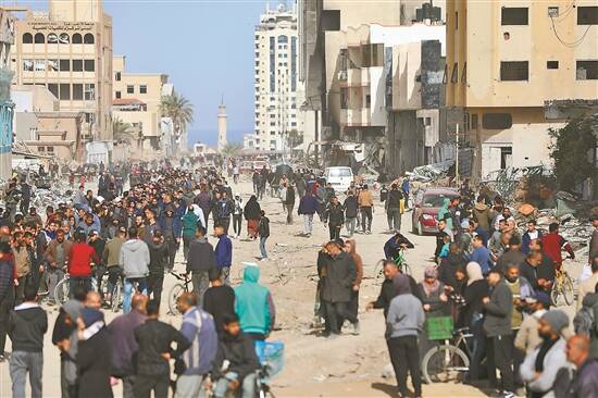 17日在加沙城拍摄的等待领取援助物资的人群 新华社发 |