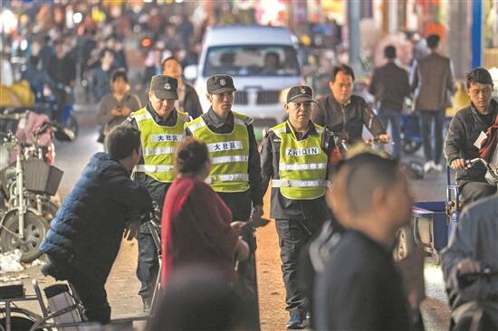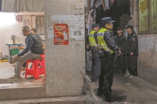 在凤阳派出所辖内的康鹭片区,日常有治安队协助警察维持秩序。这里是广州最大“制衣村”,从业人员超过30万 |