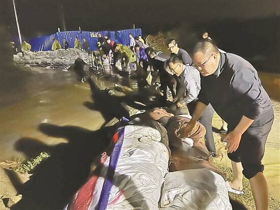 乳城镇党员干部加固河堤 |