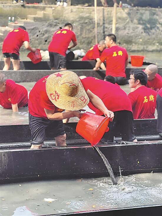 广州天河石牌村村民在倾倒龙舟中的淤泥 羊城晚报记者 卢佳圳 摄 |