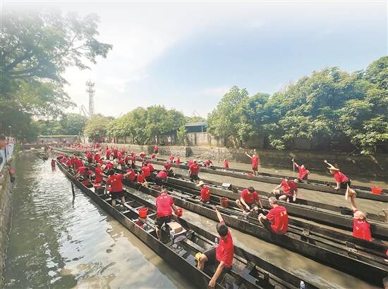 石牌村民正在热火朝天清洗龙舟 卢佳圳 摄 |