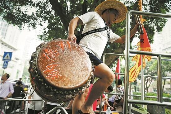村民带上牛皮大鼓准备登船 羊城晚报记者 周巍 摄 |