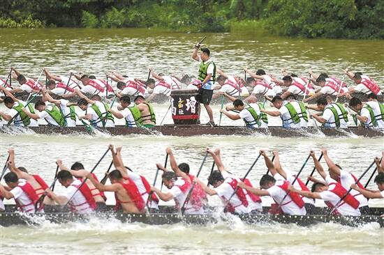 羊城晚报讯 记者符畅、冷霜、卢佳圳报道:6月6日,广州白云区人和镇流溪河蚌湖村河段热闹非凡,以“龙腾流溪 龙情人和”为主题的龙舟文化活动正在举行,吸引众多市民游客前来观看。 当日上午,伴随锣鼓声、鞭炮声,人和镇各村龙舟前往流溪河蚌湖村河段附近,举行一场别开生面的“游龙迎亲”。 据了解,鸦岗、蚌湖相隔十几公里,两地非亲非故,却因龙舟结缘而情深意长。每年,鸦岗乡亲去蚌湖“走亲戚”扒龙船;每三年,蚌湖乡亲则来鸦岗龙船会景,这一传统已延续了300多年,留下一段“双龙出海四龙归”的佳话,也体现了两地村民友爱互助、同舟共济的龙舟精神。 “嗨,我们又见面啦!”蚌湖镇湖村女子龙舟队和鸦岗村女子龙舟队的队员们水上会面后,激动地打起了招呼,一边扒龙舟,一边唱起歌。 除了游龙迎亲,吃龙船饭也是当天的重头戏,蚌湖保安和华侨会所设宴招待了前来参加活动的嘉宾和乡亲。大家欢聚一堂、其乐融融,从美食中感受传统文化的魅力。 当天下午,传统龙舟自由竞渡正式开始。22条龙舟在鼓声雷动中奋勇争先,两岸观众纷纷呐喊助威,现场气氛热烈非凡。 “龙舟文化是人和镇的特色文化,此次有多支队伍参加自由竞渡,同时也邀请了海外侨胞参加。我们希望通过发扬龙舟文化,凝聚大家的力量,共同将人和镇建设好、发展好。”人和镇党委副书记黎秀锋说。 出生在人和镇南方村的苏锐辉,10岁时随父辈出国发展,如今担任圭亚那中华会馆会长。今年端午,他特意回到家乡参与龙舟活动。“到流溪河边看扒龙船是我小时候端午节的必备节目,龙舟承载着蚌湖与鸦岗的深厚情谊,也承载着我和众多人和华侨的浓浓乡情。”他表示,此次回乡,他也感受到白云区发展的日新月异,“今后,我将继续团结带领更多侨胞发扬中华优秀文化,投身‘百千万工程’,支持家乡建设。”