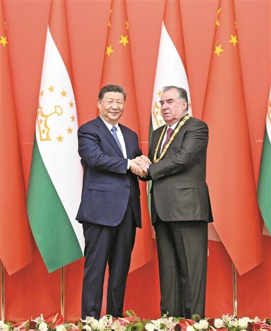 新华社杜尚别7月5日电 当地时间7月5日下午,国家主席习近平在杜尚别总统府举行隆重授勋仪式,向塔吉克斯坦总统拉赫蒙颁授“友谊勋章”。 总统府镜厅金碧辉煌,中塔两国国旗交相辉映。红色背景板上,金色“友谊勋章”图案格外醒目。 在雄壮的礼乐和热烈的掌声中,习近平和拉赫蒙一同步入厅内,登上授勋台。 军乐团奏中华人民共和国国歌。 习近平发表致辞。 习近平指出,今天我们举行隆重仪式,向中国人民的老朋友——塔吉克斯坦总统拉赫蒙阁下颁授中华人民共和国对外最高荣誉勋章——“友谊勋章”。这是中国首次在境外颁授“友谊勋章”,是为表达中国人民对拉赫蒙总统和塔吉克斯坦人民友好感情作出的特殊安排。 习近平指出,拉赫蒙总统是欧亚地区资深领导人和政治家,是中塔关系的缔造者和推动者。在拉赫蒙总统和中国领导人的亲自关心和大力推动下,中塔关系经受住了国际风云变幻考验,实现从睦邻友好到战略伙伴关系,再到全面战略合作伙伴关系的跨越式发展,各领域合作取得丰硕成果,世代友好深入人心。去年,我同拉赫蒙总统共同宣布构建世代友好、休戚与共、互利共赢的中塔命运共同体,为两国关系未来发展指明了新方向,确立了新目标。 习近平强调,这枚沉甸甸的“友谊勋章”凝结着拉赫蒙总统为推动中塔关系发展作出的杰出贡献,蕴含着两国社会各界对中塔关系美好未来的殷切希望。我愿同拉赫蒙总统一道,坚守睦邻友好,秉持互利共赢理念,共同引领中塔关系阔步前行,更好造福两国和两国人民。 王毅宣读《中华人民共和国主席授勋令》。 中方仪仗兵高举中塔两国国旗,护送中华人民共和国“友谊勋章”入场。 习近平为拉赫蒙佩挂勋章。两国元首亲切握手。全场响起经久不息的掌声。 军乐团奏塔吉克斯坦国歌。 拉赫蒙致谢辞。拉赫蒙表示,感谢习近平主席授予我中华人民共和国最高荣誉“友谊勋章”。这份荣誉是对塔吉克斯坦全体人民坚定发展塔中全面战略合作伙伴关系的认可和肯定。中国是塔吉克斯坦的伟大邻国和可靠伙伴。塔中两国之间不存在任何政治分歧和合作障碍,两国关系基于高度的相互理解、相互尊重、相互支持。长期以来,中国向塔提供了许多无私的宝贵援助,极大促进了塔国家经济发展,塔吉克斯坦人民对此衷心感谢。 拉赫蒙表示,习近平主席是当今世界具有深邃历史洞见和宏阔全球视野的伟大领导人,习近平主席提出的许多全球倡议,有利于促进人类和平和进步。塔方将继续坚定不移致力于构建塔中命运共同体。相信习近平主席这次访问必将翻开塔中新时代全面战略合作伙伴关系的新篇章,并继续引领推动上海合作组织为地区国家实现共同发展繁荣作出新贡献。 授勋仪式上,与会嘉宾十多次全体起立,全场响起长时间热烈掌声。 蔡奇等参加仪式。