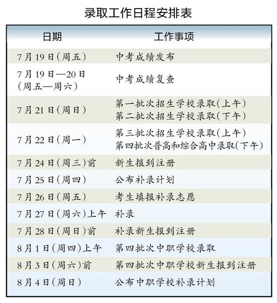 羊城晚报讯 记者蒋隽报道:7月10日,广州市招生考试委员会办公室发布2024年广州市高中阶段学校录取工作日程安排表,明确今年广州中考成绩将于7月19日发布。 具体时间安排如上: