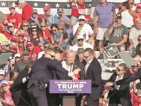 7月13日,美国前总统特朗普在宾夕法尼亚州巴特勒市的竞选集会现场被护送离开 新华社发 |