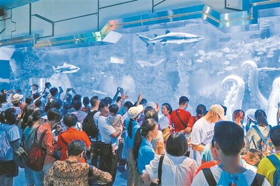 游客在广州海洋馆鲨鱼实验室拍照打卡 羊城晚报记者 潘俊华 摄 |