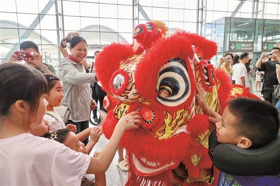 羊城晚报讯 记者黎存根、李志文,通讯员粤文旅宣、机场宣报道:7月30日,广州白云国际机场二号航站楼出发厅响起了热闹的锣鼓声,伴随着铿锵有力、节奏明快的鼓点,岭南狮舞闪亮登场。表演者们用威猛、热烈的舞姿欢迎世界各地来广东旅游、休闲度假的客人,开场便点燃现场观众的热情,大家纷纷拿出手机记录下这精彩一刻。 这是广东省文化和旅游厅为学习贯彻党的二十届三中全会精神,推动广东文化和旅游业高质量发展,结合144小时过境免签政策,举办的“请到广东过暑假”机场快闪活动。别具一格的快闪活动为来自世界各地的旅客献上了一场精彩的岭南文化盛宴。 作为岭南最具代表性的非遗项目之一,醒狮是国家级非物质文化遗产代表性项目,融武术、舞蹈、音乐等为一体。当天,两头耀眼的醒狮在白云机场出发厅与旅客们来了个“零距离接触”,兼具十足的观赏性和互动性。特别是现场的小朋友们,与生龙活虎的醒狮打成一片,欢声笑语让人感受到广东夏日活力。 曾在广州暨南大学留学的美国中文老师卡琳(Carol)更是忍不住和醒狮合影。她高兴地表示,很喜欢中国的非遗表演,她以前在缅甸当中文老师的时候就接触过醒狮,它广受外国人欢迎,再次在广州看到醒狮很有亲切感。 在白云机场二号航站楼,活动现场还设立了广东文旅展示区和文创宣传品派发区,工作人员向观众们派发了广东文旅特色定制冰箱贴、趣味粤语蒲扇等。一位外地游客表示,在机场内就已经感受到了广东浓厚的文化氛围,对此次广东之旅充满着期待。来自墨西哥的Inna和Nikita母子告诉记者,他们已经来过中国很多地方旅游,这次在广东游玩5天,去了广州长隆野生动物世界和水上乐园,还看了大马戏,这里的美食也很棒,所以很乐意向家乡的朋友推荐到中国、到广东旅游。 广东省文化和旅游厅表示,此次在广州白云国际机场举办的快闪活动,不仅向旅客展示了广东丰富的文化和旅游资源,也激发了旅客对岭南文化的好奇心和探索欲。在接下来一个月的时间里,还将邀请英歌、咏春拳、蔡李佛拳、客家山歌、粤剧、潮剧等在全国范围内具有较高知名度和影响力的非遗项目,在深圳宝安国际机场、揭阳潮汕国际机场陆续开展多场“请到广东过暑假”快闪活动,诚邀八方宾客来粤过暑假,感受岭南文化的魅力与广东文旅的热情。