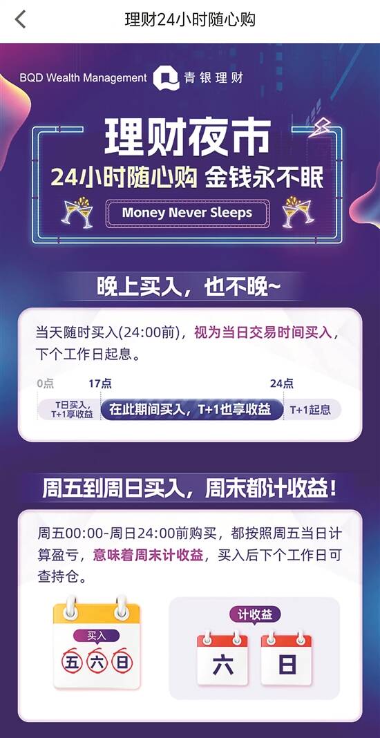 文/羊城晚报记者 黄颖琳 工作忙得团团转,上班没时间选理财产品,下班又没地方买理财,怎么办? 近日,多家银行理财公司再度上线“理财夜市”专区和特色理财产品,主打“24小时不打烊”“晚上买入也不晚”“财富跟着转,下班也能买”……与普通理财产品相比,这类产品相当于延长了购买和赎回的交易时间,不仅方便投资者夜间选购,而且起息更快、收益时间更长。 便利:“时间自由”+起息更快 近日,羊城晚报记者在工银理财微信公众号看到,该公司“理财夜市”全新上线,并同步上架了3款理财产品,申赎时间从交易日9:00-17:00延长至20:00前,只要在交易日20:00前购买,都能视为当日申购,为理财开启了“超长待机”。相比之下,工银理财其他产品的开放规则多为“每个法定工作日8:30-15:30”或者“每个证券工作日9:00-15:30/9:00-17:00”。 除了“8点档”夜市外,还有银行理财公司推出了“24小时不打烊”模式。比如,光大银行手机App近期再度上线“理财夜市”专区,推出了一款专属理财产品。该产品页面显示,“7×24小时可申赎,工作日24点前买入,按照当日净值计算盈亏”。 城商行同样紧跟步伐。青岛银行旗下理财子公司青银理财推出“理财夜市”24小时随心购服务,当天购买,下一个工作日起息后,即开始计算投资周期。 通常来讲,传统理财产品一般有一两个工作日的申购期,且需在当日规定时间前买入,第二天才有可能起息。一家股份制商业银行客户经理向记者介绍说,以周四申购为例,普通现金管理类理财产品的闭市时间为15点左右,周四闭市后至24:00的交易申请需要在T+2日确认并计算收益,也就是下周一才能有收益。现在,周四24点前(不含24点)在银行申购专属理财夜市产品,T+1日、也就是周五就能确认,等于提前三天有收益机会。 此外,从产品类型来看,均以固定收益类、现金管理类理财产品为主,风险评级较低,投资收益也较为稳健。 专家:差异化服务吸引投资者 实际上,“理财夜市”并不是新鲜概念。今年年初,包括招银理财、平安理财、光大理财、宁银理财、广银理财等在内的多家理财公司密集推出类似服务,对理财产品的申购和赎回时间予以放宽。当时不少专家认为,这波操作与银行力争今年“开门红”不无关系。 如今再度登场又是为何?招联首席研究员董希淼表示,这主要有两个方面的积极作用:其一,在原来的非交易时间之外也能方便购买理财产品,为白天上班、无暇投资的投资者带来便利。其二,只要在24时前购买理财产品,第二天就可以开始计算收益,比一般理财产品至少多出一天的收益。 董希淼还提到,“理财夜市”反映出银行和理财公司在激烈的市场竞争之下,努力探索差异化服务,以更周到细致的服务改善投资者体验,进而更好地吸引和留住投资者。与此同时,投资者需要根据自己的风险偏好、投资能力和投资需求来做好资产配置,切忌盲目跟风投资、追逐热点。 邮储银行研究员娄飞鹏表示,理财夜市常态化的可能性较大,这有助于推动扩大理财市场规模。近日,银行业理财登记托管中心发布《中国银行业理财市场半年报告(2024年上)》。《报告》显示,截至2024年6月末,全国共有239家银行机构和31家理财公司有存续的理财产品,共存续产品4万只,较年初增加0.49%,同比增加7.99%;存续规模为28.52万亿元,较年初增加6.43%,同比增加12.55%。 今年上半年,理财产品整体收益稳健,累计为投资者创造收益3413亿元,同比增长3.11%。其中,银行机构累计为投资者创造收益727亿元;理财公司累计为投资者创造收益2686亿元。另外,理财产品平均收益率为2.80%,较2023年的2.94%有所下降。