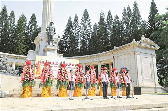 羊城晚报讯 记者侯梦菲,通讯员童恩、张宇轩报道:9月3日是中国人民抗日战争胜利纪念日暨世界反法西斯战争胜利纪念日。为铭记历史,缅怀英烈,十九路军淞沪抗日阵亡将士陵园隆重举行抗战胜利79周年纪念活动。 上午10时,活动正式开始。全体人员整齐列队在先烈纪念碑前,齐声高唱国歌。之后,同学们深情朗诵诗歌《英雄》,表达对抗战英烈的敬仰。少先队员献唱《我们是共产主义接班人》。紧接着,社会各界代表向十九路军淞沪抗战英烈敬献花篮,全体人员向抗战英烈行三鞠躬礼并敬献鲜花,缓步绕行瞻仰先烈纪念碑,表达对英烈的深切缅怀和崇高敬意。自发前来的市民游客也纷纷献上鲜花,共同缅怀抗战英烈。 参加活动的学生代表感言:“通过参加庄严的纪念仪式,我们缅怀抗战英烈的伟大功绩,并从中汲取奋发进取的力量。我是一名少先队员,我要向革命先辈学习,努力增强本领,长大后报效祖国。” 据悉,该陵园还正在开展《民族先锋,中流砥柱——中国共产党抗战英烈事迹展》,展览展期持续至9月,欢迎广大市民游客参观游览。