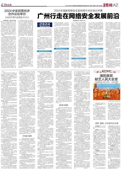 羊城晚报记者 李焕坤 罗仕 今天,2024年国家网络安全宣传周在广州南沙正式开幕。宣传周的开幕式等重要活动由广州市承办,这既是对广州网络安全工作的肯定,同时也展现了广州在构建清朗网络空间