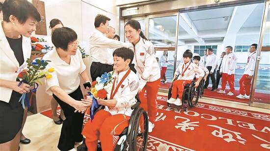 文/图 羊城晚报记者 柳卓楠 通讯员 粤残宣 “欢迎你们回家!”9月11日14时许,广州白云机场内掌声不断,广东省参加第17届夏季残奥会运动员们载誉归来。省残联举行仪式欢迎运动员们凯旋,运动员胸前闪光的奖牌映衬着他(她)们灿烂的笑容。 本届巴黎残奥会,中国体育代表团获得94金、76银、50铜共220枚奖牌,蝉联6届残奥会金牌榜、奖牌榜第一。广东获得12金、8银、4铜(12人获4项12人次铜牌)的优异成绩。其中,2人打破2项世界纪录,追平残奥会广东运动员历史最好成绩,金牌数、奖牌数居全国前列。 “妈妈,我要咬一下金牌!” “妈妈,妈妈,我在这里!”14时50分许,载誉归来的运动员依次下车,门口早已挤满了人。这当中有许多带着孩子的家属,他们正等待着家里的英雄归来。 “妈妈,我想看一下金牌,咬一口!”巴黎残奥会乒乓球女子双打冠军潘嘉敏的爱人和孩子专程从佛山赶来,为她献上了一大束鲜花。看着妈妈脖子上挂着的金牌,孩子不断抚摸,还咬了一口。“去巴黎之前,孩子就和我说,他想要金牌,想咬一下金牌。所以,孩子的期待也是我的动力之一,这次夺冠实现了他的愿望,也实现了我的愿望。”潘嘉敏说,希望接下来在训练的同时能多照顾家庭,期待2025年全国残特奥会再夺金牌。 和潘嘉敏一样,巴黎残奥会公路自行车铜牌得主孙变变的家人也来到了现场。“好长时间没见我爸妈了,第一次有这么多人来迎接我,我特别开心!”孙变变说,这次巴黎残奥会虽然没有拿到金牌,但她对自己的表现很满意,因为她拼尽全力站上了领奖台。“接下来就好好陪陪家人,然后继续投入训练,明年家门口的残特奥会争取拿到金牌。”孙变变说。 “我内心的那份热情和热爱还在” 竞技体育的魅力在于超越自我,更快、更高、更强。但在领奖台和聚光灯之外,那些没有夺奖的运动员十年磨一剑,却没有收获期待的果实。 在欢迎仪式现场,35岁的硬地滚球“老将”郑远森流下了热泪。这是他第四次参加残奥会,虽然准备充足,但依旧与奖牌擦肩而过。 “有遗憾,但我内心的那一份热情、热爱还在。我刚接触硬地滚球那会才20岁,现在都35岁了,一眨眼就15年,我整个青春都奋斗在硬地滚球这项运动上了。这是我的使命,我一定要完成它。”郑远森流着热泪哽咽地说道。 2025年,十五运和全国残特奥会将在粤港澳大湾区举办,郑远森将继续带着梦想驰骋赛场。他说:“这是家门口的比赛,我们是东道主,肯定要做好东道主应该做的。” “硬地滚球的年龄没有上限,我相信郑远森,他可以的。只要有机会,他还是会站上那个舞台的。”中国硬地滚球队教练谭巍麟说。 在欢迎仪式上,广东省残联党组书记、理事长陈学军对广东省参加巴黎残奥会情况进行总结。他介绍,广东省共50人进入中国体育代表团,其中运动员32名、领跑员2名、教练员6名、领队及工作人员10人,共参加11个大项47个项目,获得12金、8银、4铜(12人获4项12人次铜牌)的优异成绩。