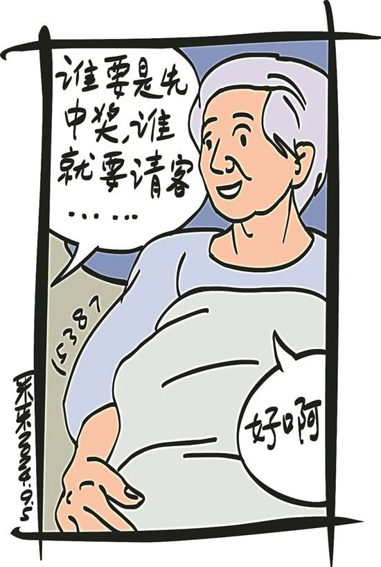 插图:采采 看望了老姐姐的奶奶回到医院后,状态和心情有了很大改观,积极配合治疗。但知道自己病情的她,情绪也难免有低落的时候。 这时,阿琪就会想办法让奶奶开心起来。他和奶奶商量,不时给自己和奶奶分别买上几注彩票,谁先中奖,谁就要请客。奶奶一听便咧开了嘴,想都没想就答应了。 细心的阿琪把彩票站的出彩走势图照下来,在手机上放大了给奶奶看,在医院的病床上和奶奶一起猜号,一起等着开奖。 实际上,阿琪是因为奶奶的关系才开始了解彩票。他发现,彩票具有公益属性,彩票公益金为老年人等群体提供了稳定的支持。阿琪认为,社会上还有不少像奶奶这样的老年人需要关爱。他决定,在购买彩票之余,通过做志愿者、捐助资金等方式,扶老助老。 在家人的陪伴下,奶奶又有了小念想,她希望这样融洽的家庭关系能够长久地持续下去。 然而,奶奶的状况每况愈下。在生命的最后阶段,她把两人叫到身边。她对阿桃说:“孙女,你找到一个好男人,奶奶可以安心地走了。”她又对阿琪说:“有你们的陪伴,我是开心快乐到终老,很知足啦。” 阿琪和阿桃紧紧握住奶奶的手。让奶奶的晚年生活充满了温暖和快乐,这无疑是对她最好的送别。 (朱延嵩)