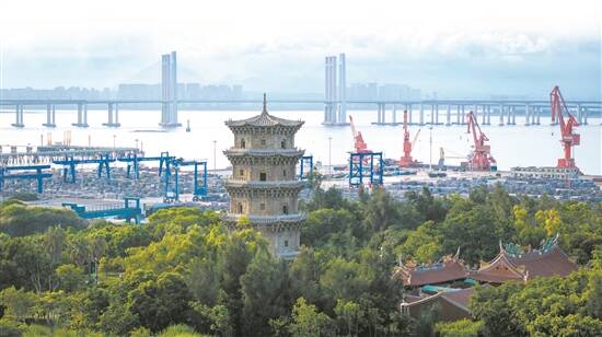 泉州六胜塔是古代海上丝绸之路的重要航标塔,如今依然矗立在泉州湾入海处。塔底下是繁忙的码头,远处是泉州湾大桥 |