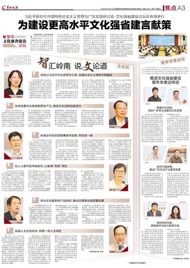 9日,习近平新时代中国特色社会主义思想与广东实践研讨会·文化强省建设论坛主论坛上,六位嘉宾学者分别立足自身研究领域作主旨发言,说文论道,献智更高水平文化强省建设。 坚持以习近平文化