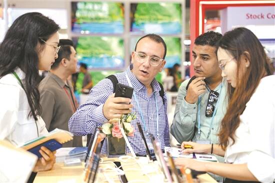 15日,采购商在广交会上了解手机产品 羊城晚报记者 钟振彬 摄