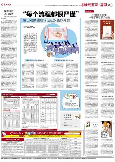 羊城晚报记者 黄颖琳 通讯员 袁苏华 插图 采采 10月20日,由广东省佛山市福彩销售网点负责人、销售员和媒体代表组成的佛山观摩团一行40人,来到北京中国福彩演播大厅,现场观看福彩双色球第2024120期开奖全过程,共同见证开奖的“公平、公正、公开”。 排队购买双色球等待开奖 当天19时许,统一着装的佛山观摩团全体成员来到中国福彩双色球开奖大厅。一下车,见到一楼福利彩票销售站,大家立刻排起了队来购买双色球。“第一次亲眼看到双色球开奖,机会太难得了,必须得买几注。”“给我来五注机选,打2倍。”大家排队购买双色球,还互相祝福着晚上中大奖。 随后,在工作人员的带领下,观摩团成员来到四楼福彩文化展厅。讲解员的介绍让大家深入了解福利彩票从无到有、由小到大的发展之路,深刻体会到中国福利彩票为公益事业发展作出的贡献。 经过严格安检后,观摩团成员走进开奖演播厅,共同观看福彩宣传片,了解福彩开奖全流程,感知福利彩票的阳光、公开和透明。 1注双色球能筹集多少公益金?双色球摇奖机有多高?福彩知识竞答游戏,将气氛推向了高潮。大家积极抢答问题,在欢笑声中了解福彩知识。随后,观摩团成员轮流感受、触摸退役摇奖球,真实感受双色球摇奖球的材质与重量。 佛山市福彩中心主任汤显达被大家推荐作为现场观众代表,与云南观摩团的一位代表一起上台通过抽取扑克牌形式,选取了当期的开奖用球。“从事彩票工作这么多年,双色球这一期开奖是我最难忘的一次,很荣幸亲手选出摇奖球,这是非常宝贵的体验”。 聚精会神紧盯每一个步骤 经过摇奖机测试、选球、取球、装球等操作后,21时15分,令人期待的双色球2024120期开奖正式开始。在公证人员监督及观摩团代表的共同见证下,工作人员开箱、取球、放球、启动开关,逐一摇出当期开奖号码。整个开奖准备和开奖直播过程,都在公证人员监督、演播厅顶部全方位高清摄像头实时监控及观摩团成员的共同见证下完成。 开奖过程中,大家都认真地盯着摇奖机,所有人聚精会神地紧盯每一个步骤,仔细对照着手中的彩票号码,共同见证了开奖全过程。 来到开奖现场,观摩团成员对福利彩票阳光开奖和公开、公平、公正的形象都有了更深的体会。佛山福彩观摩团成员、佛山市新闻传媒中心主持人邓勇观看开奖后很感叹:“亲眼见证阳光开奖,每个流程都很严谨,我深刻感受到了福彩的规范透明,以后要当好阳光福彩的宣传员,让更多的人了解福利彩票,支持福利彩票事业。” 自2005年4月12日福利彩票演播大厅迎来首批现场嘉宾,近20年来,无数来自全国各地各行各业的观众在现场见证一个又一个历史瞬间。这次带队的广东省福彩中心营销部负责人表示,开展“走近双色球”活动,就是让大家见证开奖的公平、公正和公开。通过近距离观摩开奖,可以让参与者感受到开奖全程的专业性和严谨性。
