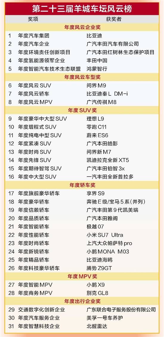 羊城晚报记者 潘亮 戚耀琪 张爱丽 作为华南地区汽车行业专业评选品牌之一,由羊城晚报社、金羊网联合主办的“第二十三届羊城车坛风云榜”评选今日正式放榜。榜单评选出年度汽车集团、年度汽车企业、年度环境责任创新项目、年度氢能源领军企业、年度智能汽车技术生态联盟及各类别车型奖共31个奖项。 其中,评审组从上百款热门车型中,结合品牌影响力、人气、口碑、技术创新等多维度指标,评选出年度风云SUV、年度风云轿车和年度风云MPV三大车型及细分奖项,获奖车型是今年车坛中当之无愧的引领风云的实力派。对于消费者而言,完全可以以“第二十三届羊城车坛风云榜”获奖车型作为权威指南进行购车参考。展望2025年,以创新应万变,中国汽车产业毫无悬念仍将引领全球汽车产业变革大潮,让我们在此致敬那些为中国汽车产业作出贡献的企业和汽车人们。 奖项:年度汽车集团 获奖者:比亚迪 获奖理由:比亚迪长期坚持新能源战略,从未动摇绿色梦想,围绕国家“双碳”战略目标,2022年停产燃油车,全身心投入新能源汽车的研发与技术积累,让更多用户体验到新能源汽车快省静顺绿的优势,有力支撑销量增长。比亚迪秉承“技术为王、创新为本”的发展理念,在新能源汽车领域拥有20多年的技术积累,累计研发投入超1500亿元,目前研发人员超10万名,是世界上研发人员最多的车企。后面还会持续加大研发投入,以技术实力引领科技创新。 奖项:年度汽车企业 获奖者:广汽丰田 获奖理由:自2004年成立以来,广汽丰田始终秉承“顾客第一”的理念,致力于为中国消费者提供高品质、高价值的汽车产品和服务。广汽丰田不断满足消费者日益多元化的需求,多款车型凭借卓越的品质和性能赢得了市场的广泛认可,并多次荣登细分市场销量榜首。 作为丰田全球战略的重要组成部分,广汽丰田积极引进并吸收丰田的先进技术,同时结合中国市场的实际情况进行本土化研发,不断提升产品的竞争力。在电动化浪潮下,广汽丰田率先导入丰田THS双擎混动技术,引领中国汽车市场的混动化趋势。 奖项:年度环境责任创新项目 获奖者:广汽本田红树林生态保护项目 获奖理由:2023年开始,广汽本田联合携手SEE基金会正式启动红树林生态保护项目,在第一个五年计划中,对海南文昌和广东湛江的1800多亩红树林,开展红树林生态修复、蓝碳项目开发、社区保护、物种保护等系列行动。为了积极落实保护行动,广汽本田与SEE基金会、广东湛江红树林国家级自然保护区管理局一起探索、实践了基于自然的全新解决方案,从生态保护、公众教育和环境可持续发展这三大方面,建立起科学、高效的红树林生态修复方案。 奖项:年度氢能源领军企业 获奖者:丰田中国 获奖理由:为助力中国实现碳中和的目标,进一步推动中国氢能社会发展,丰田扎根中国,从“产、学、研”等各个领域持续扩大朋友圈,共同推进氢能产业发展的同时,积极推动在华氢能事业举措落地。今年8月,丰田中国氢能事业总部成立,丰田燃料电池研发与生产专用工厂在北京投产,通过新质生产力的本地化努力,将进一步加快适合中国市场的产品的研发与市场投入速度,助力氢能技术的普及与应用。 奖项:年度智能汽车技术生态联盟 获奖者:鸿蒙智行 获奖理由:华为鸿蒙智行旗下问界、智界、享界、尊界坚持以用户体验为中心,制定了远高于行业的严苛质量标准,从设计到制造多个环节都精益求精,确保用户享受到极致的品质与服务。同时,鸿蒙智行凭借其开创性的智能互联技术,实现了车机与移动设备的无缝协同,为用户带来前所未有的智能出行体验。鸿蒙系统以其强大的生态整合能力,促进了产业链上下游企业的紧密合作,加速了智能汽车技术的创新与应用,为构建开放、共赢的智能汽车生态树立了典范,展现了卓越的领导力和行业影响力。 奖项:年度风云SUV 获奖者:问界M9 获奖理由:作为全景智慧旗舰SUV的代表,问界M9以连续6个月蝉联50万元以上豪华车型销量冠军的佳绩,不断刷新中国新能源汽车品牌的销售纪录。上市10个月,累计大定超16万辆,问界M9凭借其卓越的全场景智慧出行体验、豪华舒适的驾乘空间及领先的智能驾驶辅助系统,重新定义了高端智能SUV的标准。其强大的性能与超长续航能力,赢得了市场与消费者的广泛赞誉,彰显了问界品牌在智能汽车领域的深厚底蕴与创新引领。 奖项:年度风云轿车 获奖者:比亚迪秦L DM-i 获奖理由:5月28日,比亚迪王朝重磅新车秦L DM-i在西安上市,首搭第五代DM技术,售价9.98万-13.98万元,百公里油耗达到划时代的2.9L,“一箱油”满油满电综合续航达2100公里,引领中级,开创油耗2时代,堪称“工业奇迹”。自5月上市以来,秦L DM-i销量一路高歌猛进,10月销量首次突破5万辆,累计销量突破19万辆,并多次蝉联中级轿车月度销冠宝座,更在第三季度强势夺取中级轿车季度销冠。 奖项:年度风云MPV 获奖者:广汽传祺M8 获奖理由:如果MPV有段位,那传祺M8就是王者。自2017年首款M8亮相以来,传祺不断推陈出新,相继推出了M8领秀、大师、宗师三大系列,并针对用户的不同需求,精心打造了多款个性化车型。不仅全面满足家庭用车的需求,更在高端商务领域树立了新的行业标杆。 世界汽车看中国,中国MPV看传祺。随着传祺M8超级混动版的推出,传祺MPV家族版图再扩员,为不同需求的消费者提供出行新选择,如今已累