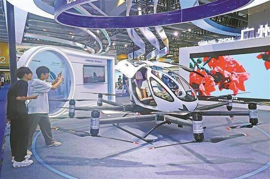 中博会上展示的无人驾驶的垂直起降飞行器 羊城晚报记者 刘畅 摄 |