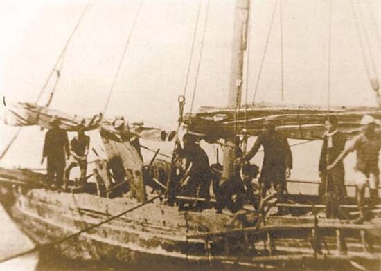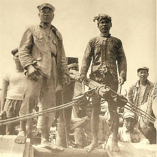 船工挺立船上等待出征命令 图片来源:中共湛江市委党史研究室 |