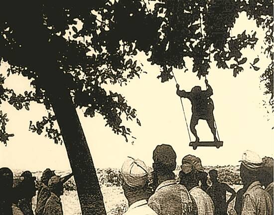 四野渡海作战兵团的战士们进行适应海上作战训练——荡秋千 图片来源:中共湛江市委党史研究室 |