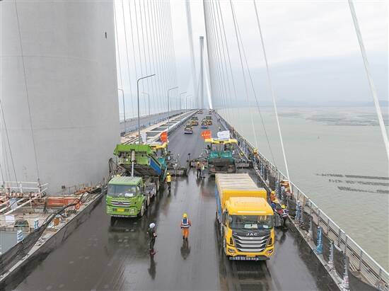 黄茅海跨海通道钢桥面铺装现场 通讯员供图 |