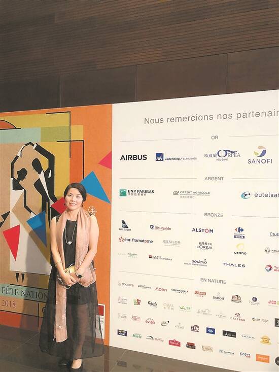 2018年,李华参加法国国庆招待会,背景墙上法国公司大多都是她曾经的客户 |